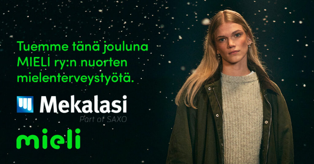 Tänä jouluna Saxo-konsernissa (Saxo, Mekalasi ja Aina PTT) halusimme muistaa erityisesti lapsia ja nuoria ja päätimme lahjoittaa hyvää joulumieltä tukemalla MIELI ry:n toimintaa. Tuki käytetään nuorten mielenterveyden hyväksi. Toivotamme kaikille asiakkaillemme ja yhteistyökumppaneillemme hyvää joulua ja onnellista uutta vuotta 2026!