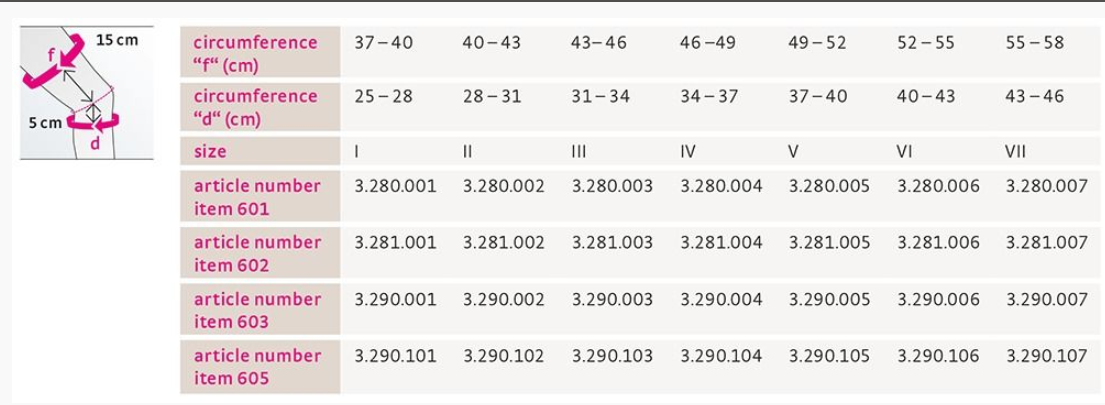Oikea koko valitaan ottamalla reiden ja säären ympärysmitta. Reiden ympärysmitta (f) mitataan 15 cm polven yläpuolelta ja säären ympärysmitta (d) mitataan 5 cm polven alapuolelta.