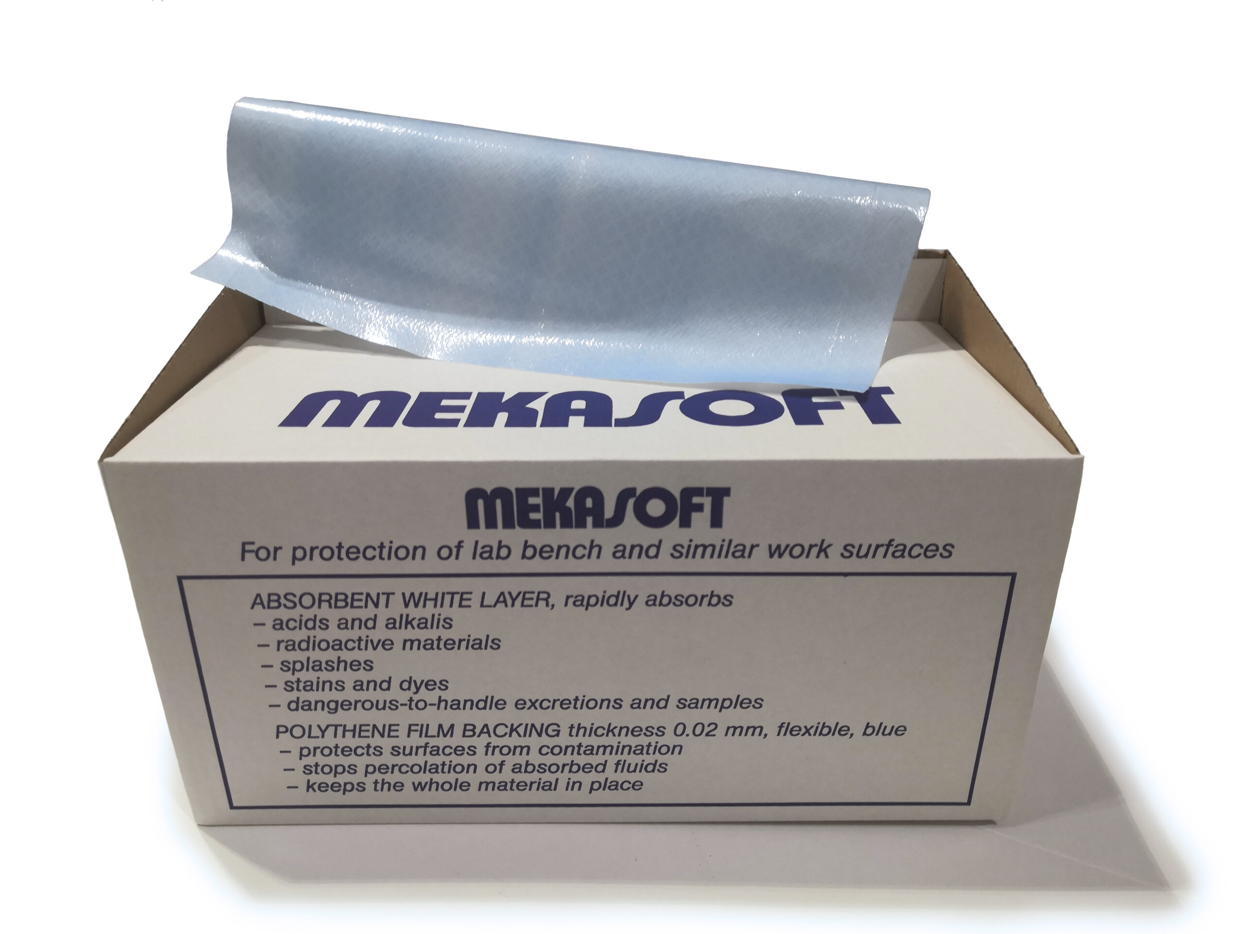 Mekasoft sopii erityisesti pöytäpintojen suojaamiseen. Valkoinen kerros imee nopeasti hapot, emäkset, radioaktiiviset tai värjäävät aineet sekä tartuntavaaralliset eritteet ja näytteet. Sininen polyeteenikalvo - paksuus 0,02 mm - ei läpäise imeytyneitä aineita ja pitää pöytäsuojan paikoillaan. Kätevä rullapakkaus.