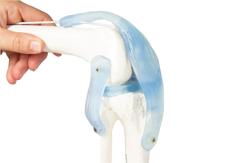 Ihmisen polvinivelen luonnollinen kipsi. Varren ja alaosan kannot. Rectus femoris -lihaksen sisäänvientijänne, polvilumpio polvilumpion jänteineen, nivelsiteet, nivelkineet ja ristisiteet on valmistettu elastisesta muovista. Polvinivelen tärkeimmät liikkeet, kuten taivutus ja venyttely, ulkoinen ja sisäinen kierto, voidaan osoittaa. Irrotettavalla jalustalla.