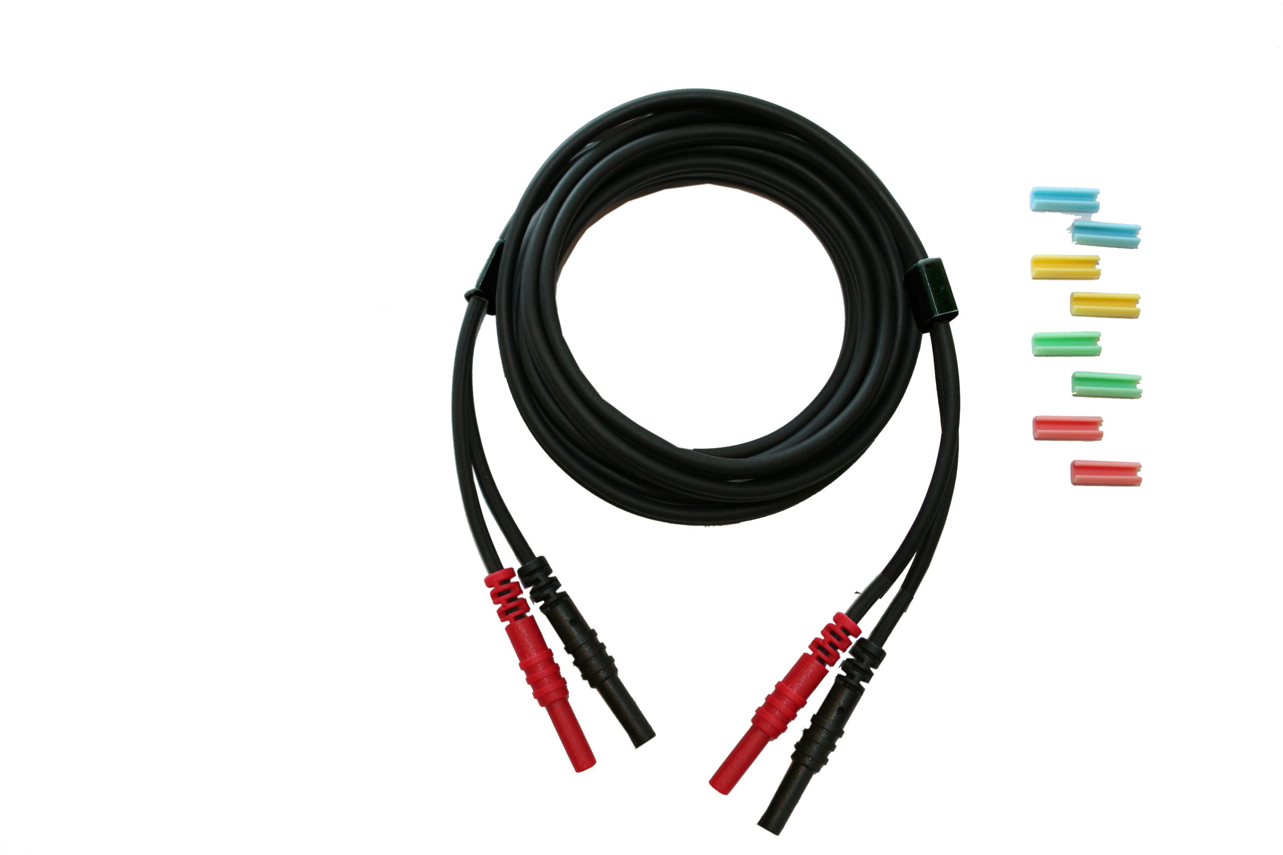 Potilaskaapeli Enraf-Noniuksen sähköhoitolaitteisiin. Tähän voidaan kiinnittää erilaisia elektrodeja. Musta, jossa väriklipsejä.