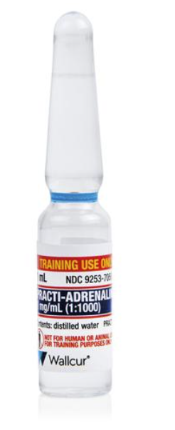 Practi-Adrenaline on realistinen simuloitu lääkeampulli, joka jäljittelee adrenaliinia (epinefriiniä). Jokainen 1 mL ampulli sisältää tislattua vettä, joten se on turvallinen käytettäväksi harjoitusnukeilla ja nesteen kanssa yhteensopivilla koulutusvälineillä.